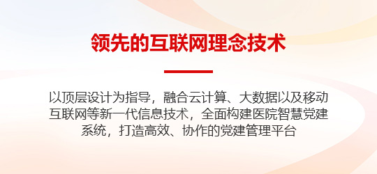我们以“互联网+”思维、云计算和大数据技术致力于为医院搭建起契合组织要求、符合医院需求、贴合党员/党务工作特点的党建管理全链条、专业化党建管理服务平台。